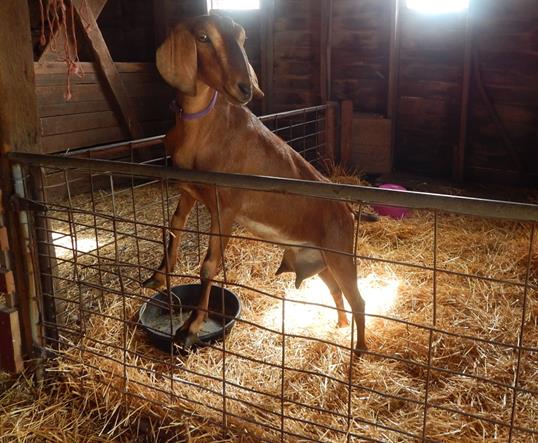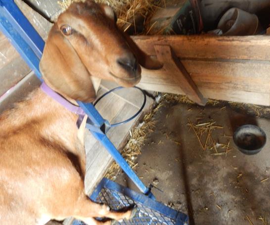She usually finishes her feed at about the same time I finish milking. Once her dish is empty, she throws it on the floor, then gives me that, “don’t forget to take the hobbles off” look.
