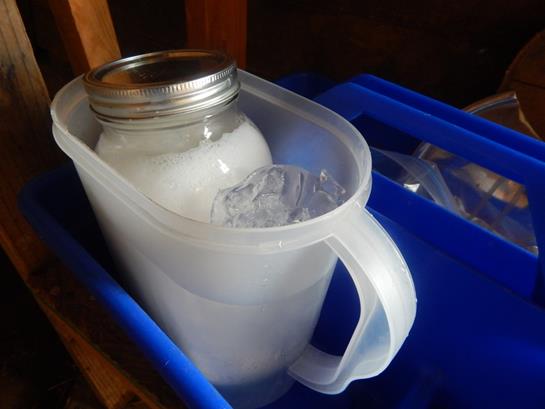 Right after milking, I pour the milk into a jar and place it in a pitcher of ice water so it can chill down. Sometimes the milk can have a slight goaty after taste, but just from my short experience with milking, I’ve learned the key to great tasting is to cool it down as soon and as fast as possible. I turn Nutmeg loose with the rest of the heard and finish up the rest of the chores while the milk continues to chill.