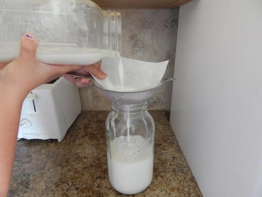 Once I get back to the house, I strain the milk into a clean jar and store it in the refrigerator. I use a fine mesh strainer that I line with a square milk filter which works really well and is cheaper than buying a special milk strainer.