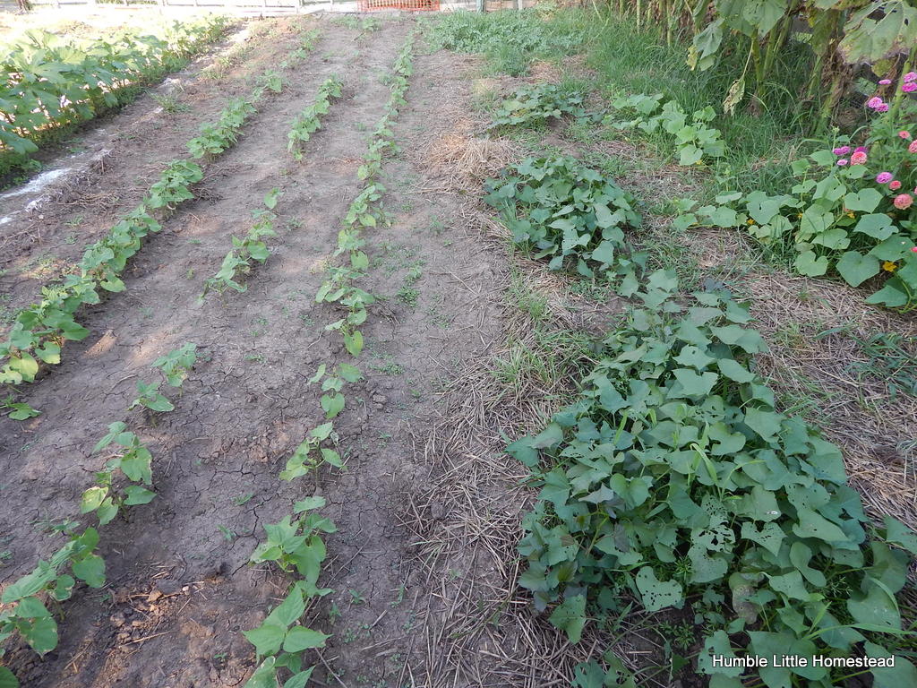 On the other end of the garden, we planted more beans…. why we did that, I don’t really know. All I do know is if they all produce good, we will be wondering, “what in the heck we were thinking”, while being hunched over with aching backs picking them all. I already have a back ache just thinking about it. It will be nice to have a pantry stocked full of canned beans this winter, so that will be my motivation to get through it. Also pictured are sweet potatoes and cucumbers. This is my first year growing sweet potatoes, so I’m not sure what to expect with them. I had to replant cucumbers so they are just now starting to grow good and get a few blooms.