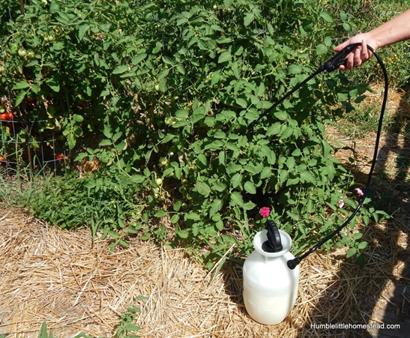 For about two months, I’ve been spraying my garden weekly with a 50/50 mix of raw goat milk and water. I put it in a pump sprayer and set the nozzle so that it sprays a fine mist. For tomatoes, I spray them enough that the leaves are covered but not dripping wet.