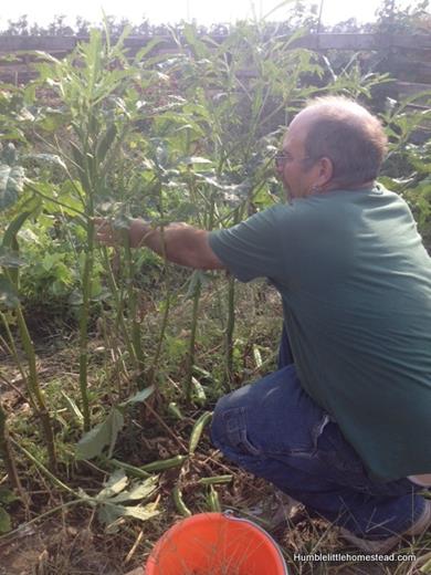 I got Michael to help me pick the okra while I picked tomatoes. He thought staying inside and napping sounded like more fun, so he said I was being a big slave driver. But the way I look at it is… he who wants his wife to can up some pickled okra better get out there and help pick it. We have a lot of fun working in the garden together. 🙂  As you can tell by the picture, I’ve really neglected the okra so there was quite a bit that was way overripe. He was able to find enough small ones to make a small batch of pickled okra, plus some medium sized ones that we fried for supper. There’s more growing so hopefully I will have enough to make another small batch in a few days.