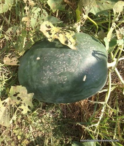 The watermelon patch has several nice sized watermelons in it, but none are quite ripe yet. We almost picked the one pictured below but decided to wait just a little while longer because we were unsure if it was completely ripe. According to this article on watermelons, it’s a good thing we decided to wait. The bottom isn’t quite cream or yellow colored yet and the tendril is just starting to show signs of dying, so we’ll pick it towards the end of the week.