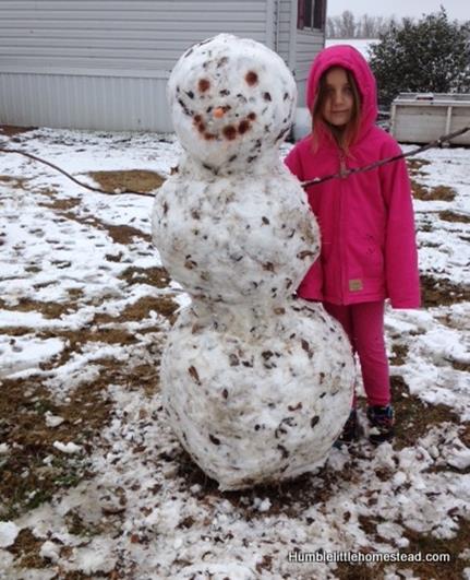 You know, snow might not be that bad after all…. especially if it’s like this. Not a lot but yet just right to build a snowman just Miley’s size. Next time snow’s in the forecast, instead of cringing, I’ll smile and look forward to some fun.