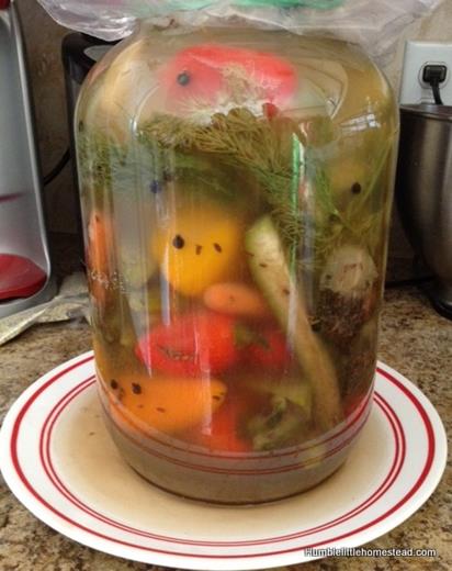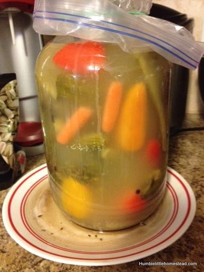 Next, take a zip lock and put it into the jar, making sure that it covers the surface of the brine across the jar. Pour a little more brine in so that it fills the head space and squeezes out all the air. I used a smaller jar filled with water to weigh down the vegetables. It’s very important that all vegetables stay fully submerged under the brine and aren’t exposed to air. Put a rubber band around the top of the jar to hold the bag in place. Set the jar on a plate or bowl to catch any liquid that spills out as it ferments.