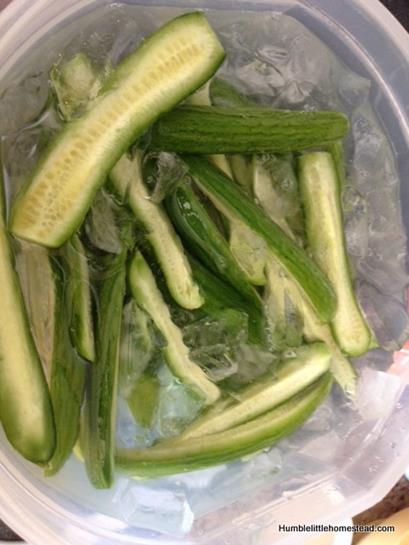 Next slice cucumbers and put them on ice for about 20 minutes. This helps them to maintain crispness. You can also leave the cucumbers whole if you prefer.