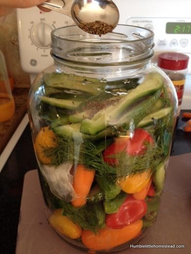 Once the cucumbers are done soaking on ice, you can start layering the vegetables, sprigs of dill, garlic and tea bags in the jar. One very important step in having your pickles turn out crispy is to add a tannin containing agent to the jar. Some sources of tannin are oak leaves, grape leaves, horseradish leaves or black tea. I use black tea because it’s easiest to find. The tea doesn’t affect the flavor of the pickles. Once it’s all layered nicely in the jar, add the spices.