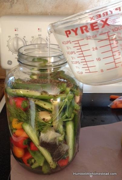 Next, you need to mix 1 Tbsp sea salt to 2 cups of water. This amount is for a quart jar, if you’re making a larger batch, you need to adjust accordingly. Since I’m using a gallon jar, I used 4 Tbsp to 8 cups of water. The amount of vegetables and spices can be changed according to taste, but it’s important to keep the salt to water ratio the same.