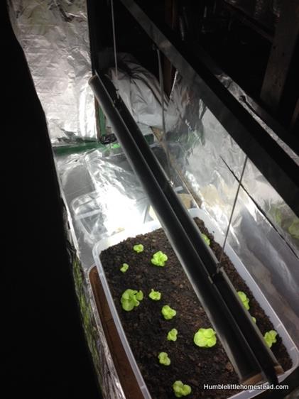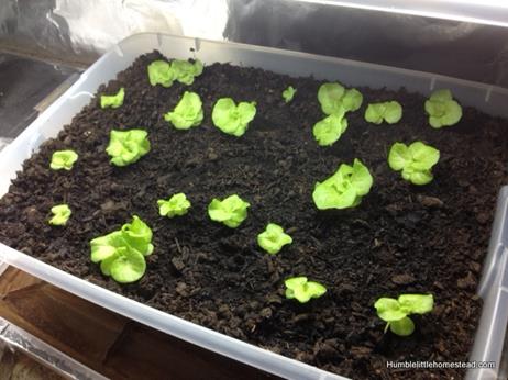 I got a plastic tote, drilled some holes in it, filled it with dirt, and put the lid under it to catch excess water. We planted the lettuce, which is growing very slowly, but looking good…