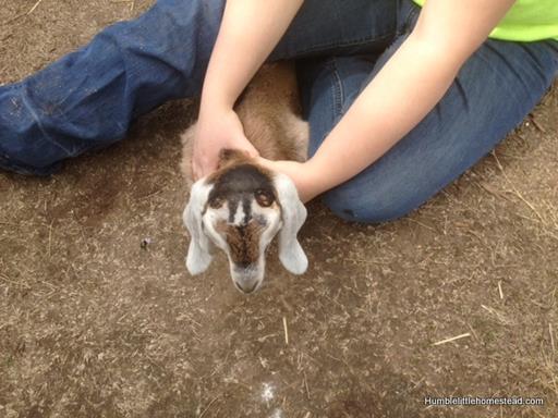 Having to disbud kids is our least favorite part of goat maintenance. 😦 It’s always awful while you’re doing it, but it’s a whole lot better to get rid of their horns while they’re little than it is for them to get caught in fencing or possibly injure each other with them.