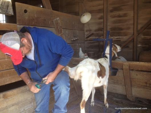 Once we got that done, Michael helped us trim hooves and vaccinate them. We also wethered one buckling and decided to leave the other intact, that way we can use him for breeding later. I forgot to get the wormer, so we’ll worm them in a few weeks when we give the kids their booster vaccines. It sure is nice to have most of the goat maintenance done for another year.