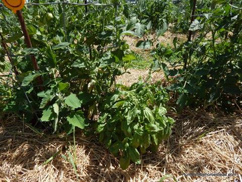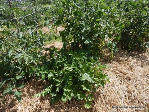 Basil and parsley always grow well with tomatoes. Parsley attracts wasps that will kill the tomato hornworm and basil improves both the flavor and growth of the tomatoes. I only have one parsley plant and a few basil plants, so I don’t know how effective they really are compared to the number of plants we have. It would be really nice to plant them all through out the rows of tomatoes, but buying that many gets to be a little expensive. Maybe one of these years I will try starting them from seed.