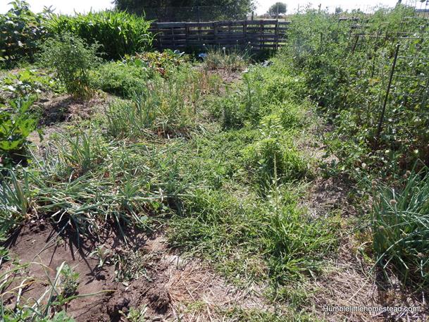 Yeah… not very neat and tidy, is it? Somewhere in there, buried beneath the weeds is a walk way. You definitely don’t get that calm, peaceful feeling when you walk in… it’s more like a tense, be on alert and ready to run feeling due to not knowing what kind of creature might jump out from under those weeds. At least it keeps us alert and on our toes.  I think I’ll have to give up on the goal of having a neat garden for this year and try for it another year.