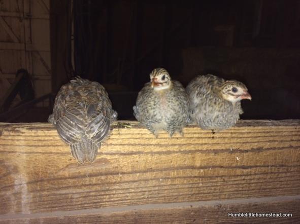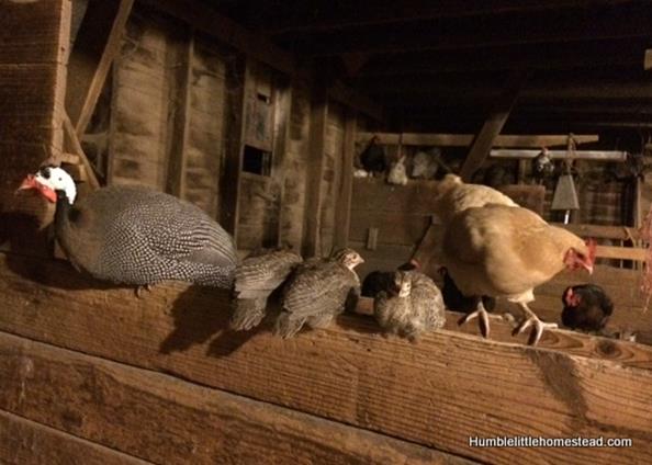 We were surprised to see them sitting there because the mama guinea always took them out in the tall grass behind the barn each night, while the rest of the flock roosted in the barn as usual. We always worried about her and the keets being outside alone at night without the others to help protect them. It was a mystery to us why she did that rather than finding a comfy spot in some straw in the corner of the barn. I’m sure she had her reasons though.